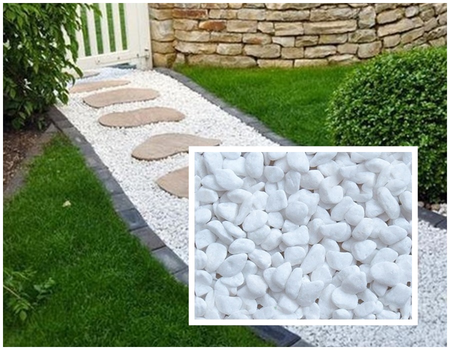 Sỏi trắng quay thường được sử dụng để trang trí nội, ngoại thất như Ốp tranh đá, tiểu cảnh sân vườn, trang trí gốc cây, bồn hoa, hồ cá, bể bơi; trang trí biệt thự, dải lối đi…Sỏi vàng tự trang trí có nhiều nhiều kích cỡ khác nhau.